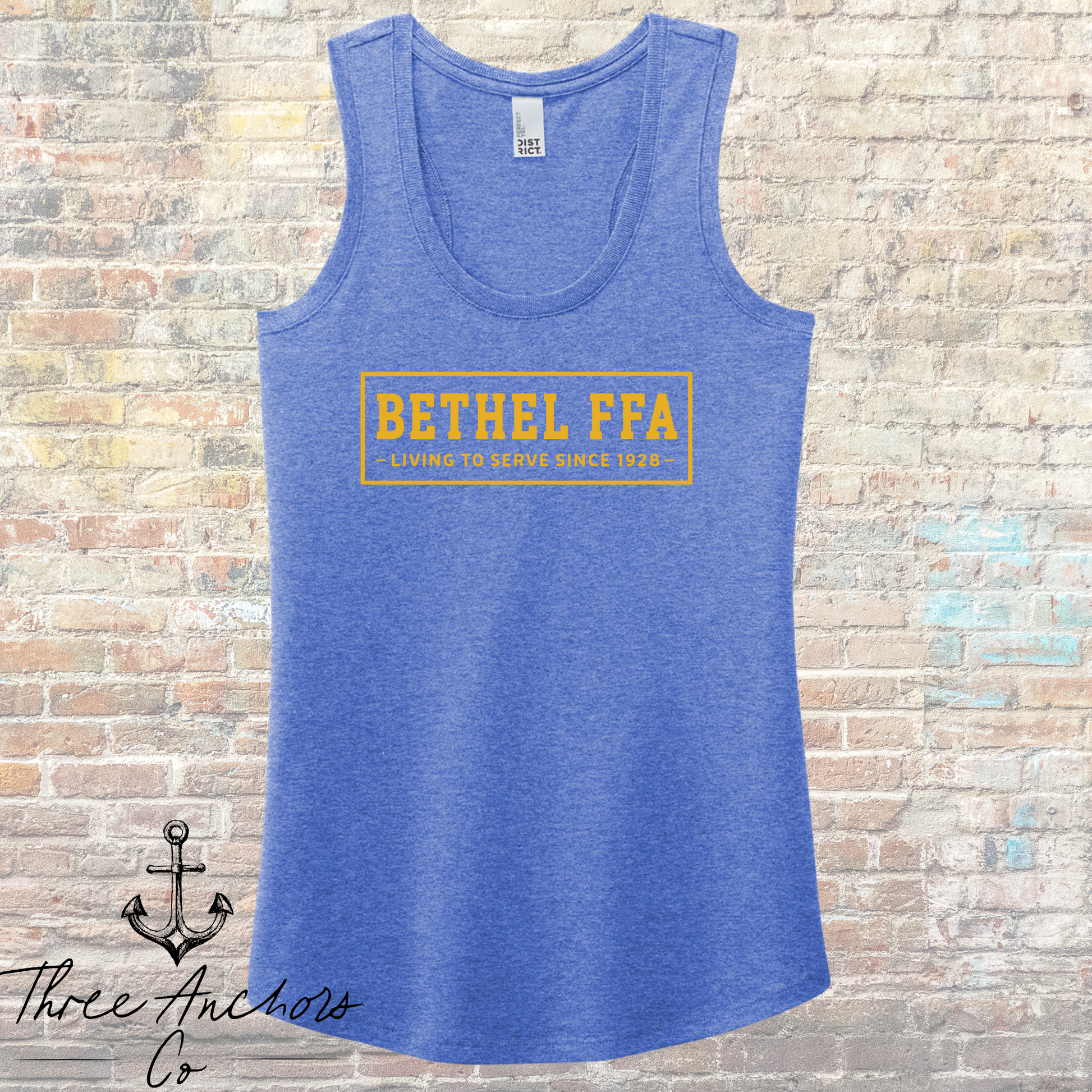 Choose from a racerback tank in cream or royal blue with Bethel FFA on the front